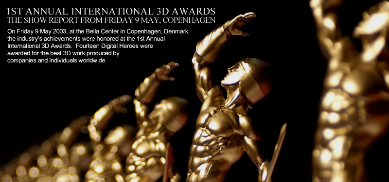 The 1st Annual International 3D Awards ceremony, sponsored by HP, NVIDIA and Alias|Wavefront, was held on Friday 9th May in Copenhagen, Denmark at the Bella Center. All through the 3D Festival events, this was the one event that people were looking forward to, when the fourteen Hero Trophies would be awarded for the best 3D projects of 2002-2003.
